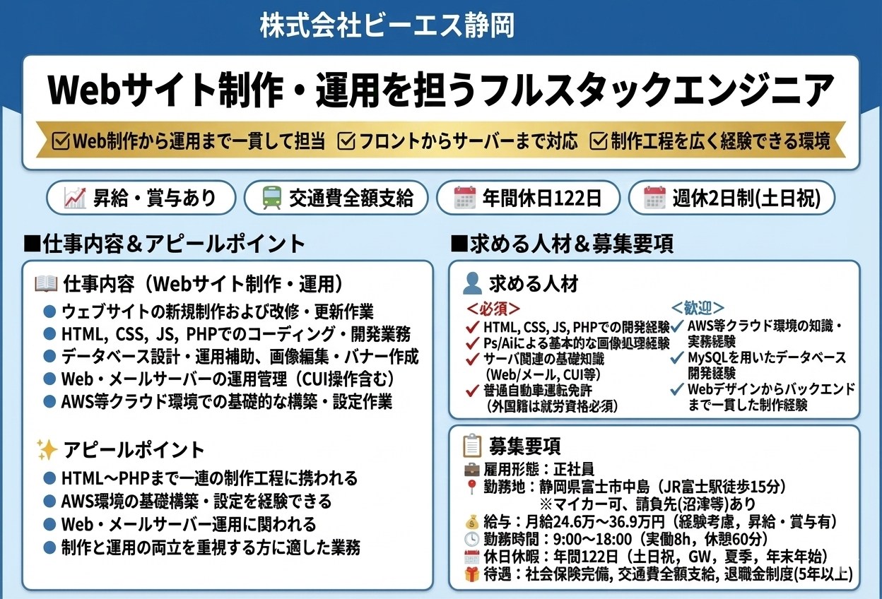 ウェブサイト制作・運用・管理業務をご担当いただきます。フロントエンドからバックエンド、サーバー管理、画像処理まで幅広い工程に携わるフルスタックのポジションです。