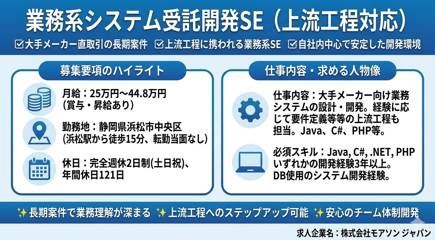 ▼大手メーカー直取引の長期案件▼上流工程に携われる業務系SE▼自社内中心で安定した開発環境