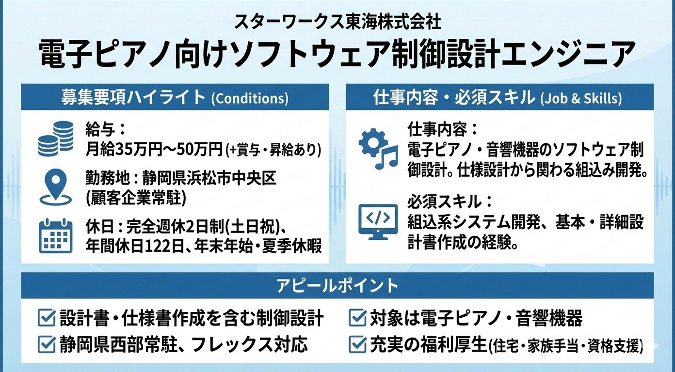 ▼電子ピアノの制御設計を担当▼仕様設計から関わる組込み開発▼静岡西部エリア常駐案件