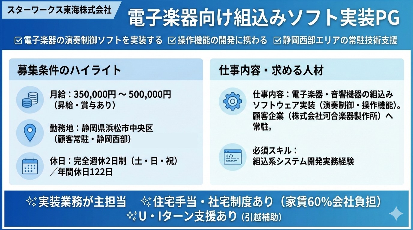 ▼電子楽器の演奏制御ソフトを実装する▼操作機能の開発に携わる組込みPG▼静岡西部エリアの常駐技術支援