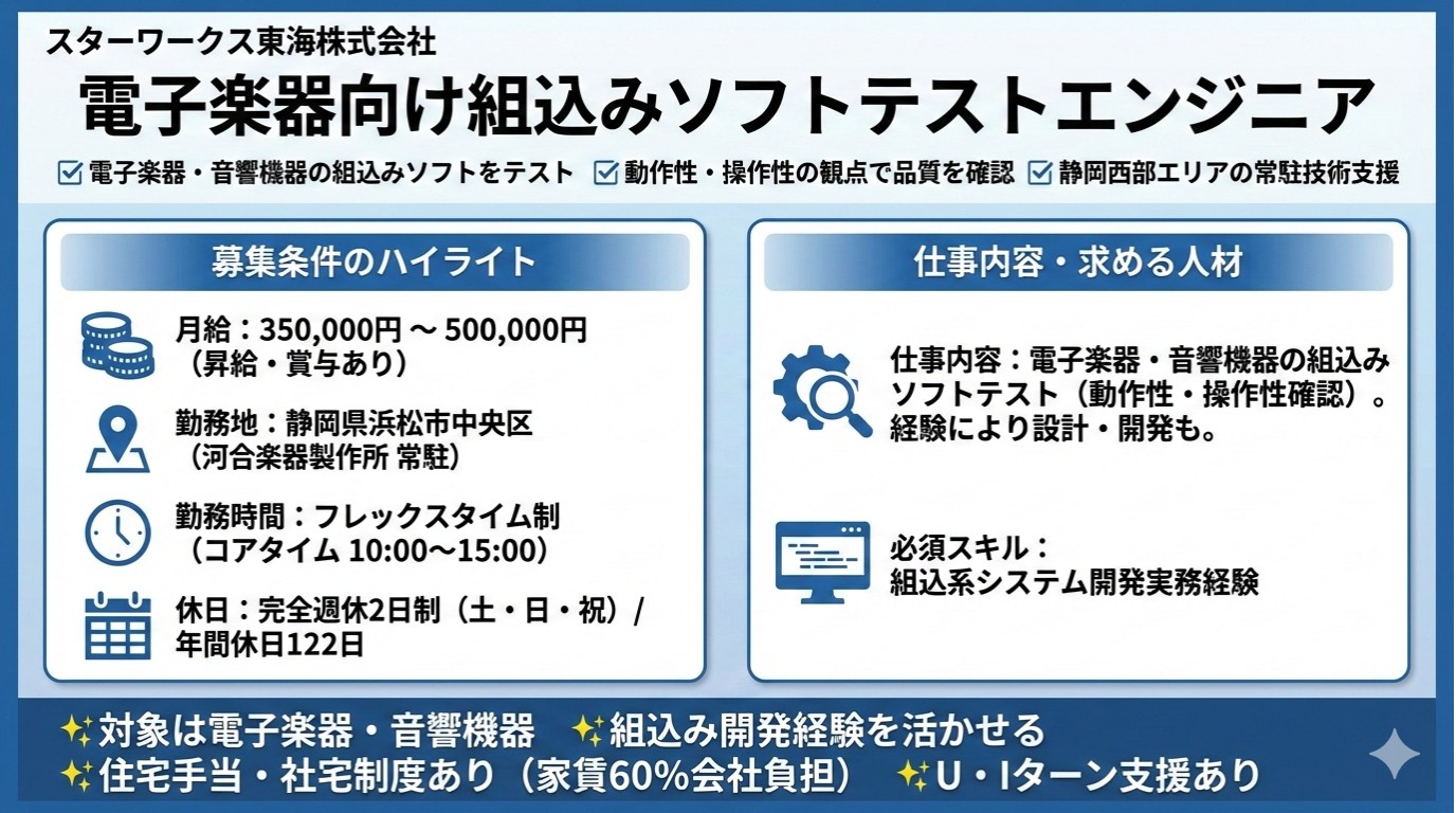 ▼電子楽器・音響機器の組込みソフトをテスト▼動作性・操作性の観点で品質を確認▼静岡西部エリアの常駐技術支援