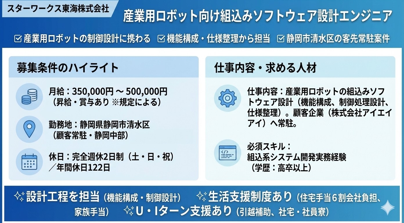 ▼産業用ロボットの制御設計に携わる▼機能構成・仕様整理から担当▼静岡市清水区の客先常駐案件