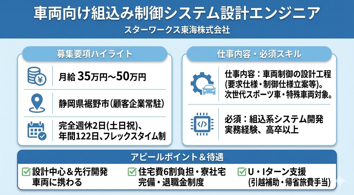 ▼車両制御の設計工程に携わる▼次世代スポーツ車両を対象▼フレックスタイム勤務
