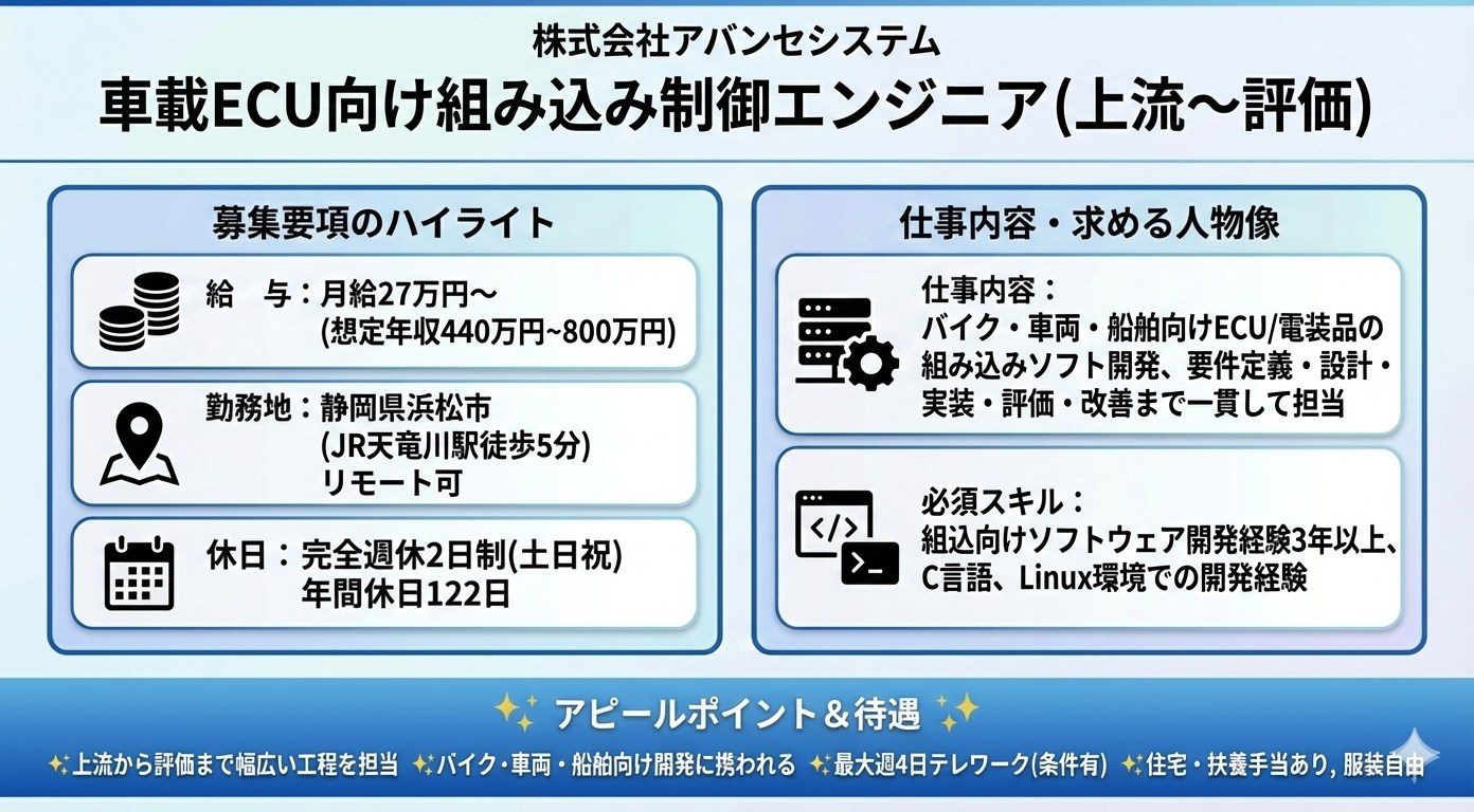 ▼要求分析~要件定義~評価まで一貫して担当▼バイク・車両・船舶向けECU開発に携わる ▼最大週4回のテレワーク制度あり