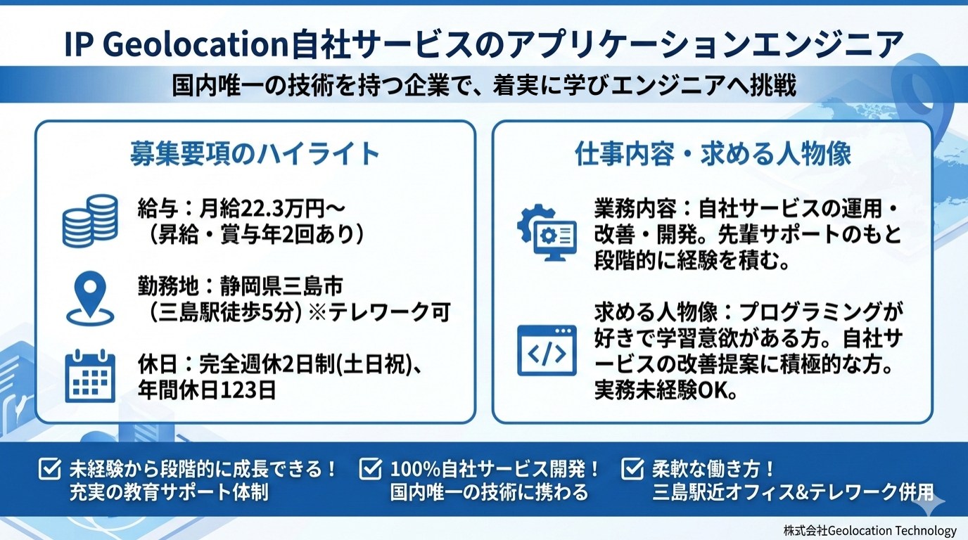 ▼先輩支援のもと運用・改善から開発へ挑戦 ▼IP Geolocationの自社サービスを担当 ▼三島駅徒歩5分+テレワーク併用