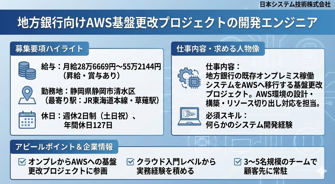 地方銀行常駐で、既存オンプレミス稼働システムをAWSへ移行する基盤更改プロジェクトに参画する開発エンジニアです。AWS環境の設計・構築・リソース切り出し対応を実施します。