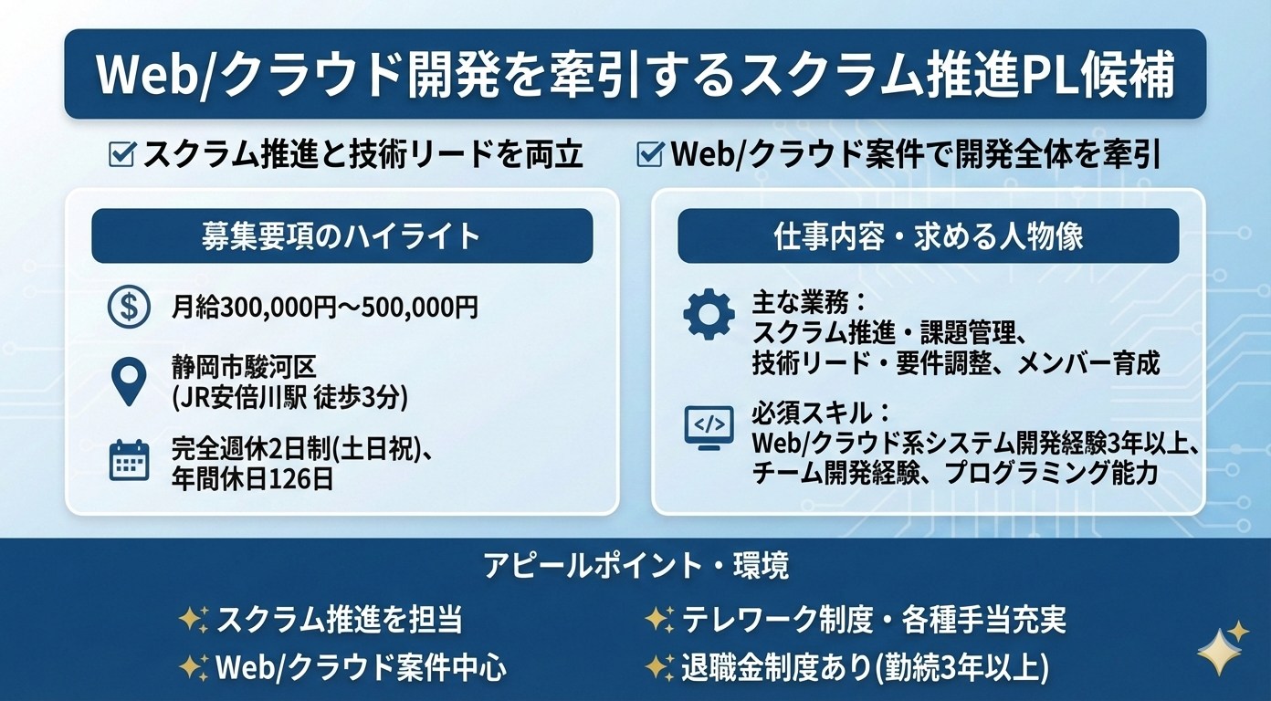 | 仕事内容 | ■業務概要 Web/クラウド活用のシステム開発プロジェクトを技術面でリードし、メンバー育成やスクラム導入なども担当するリーダー候補職です。 ■プロジェクト例 ・首都圏向けWeb業務システム開発:大手SIerなど首都圏企業からの案件を静岡本社・開発センターで受託し、Webベースの業務システムを開発。 ・クラウドシステム構築・運用支援(AWS・Azure等):クラウドインフラを基盤とした業務システムや顧客ポータルサイトの構築・運用を支援するプロジェクト ・アジャイル型Webサービス開発(スクラム体制) ・業務システム保守・機能追加:既存システム(業務系・基幹系)の保守開発を通じて、顧客課題に対応しながら改善提案を行うプロジェクト ■業務内容 ・スクラムマスターまたは候補として、チームビルディング、スケジュール管理、課題管理を推進 ・顧客との要件調整・折衝を含む開発全体の技術リード ・技術面とマネジメント面双方において、メンバーを牽引する役割を担います ■環境 ・フロントエンド:HTML、CSS、JavaScript(React/Angular/Vue.js/jQuery等) ・バックエンド:Java、C#、PythonなどのWeb/クラウドベースのシステム ・DB:Oracle、PostgreSQL、MySQL等 ・クラウド:AWS、Azureなど多様な環境の構築・運用が対象 ・開発手法:アジャイル開発(スクラム)中心、スクラムマスター業務を兼務 ■体制 ・チーム規模:5-10名程度(20-50代構成)、リーダー8名・チーフリーダー1名程度の組織構成 |
