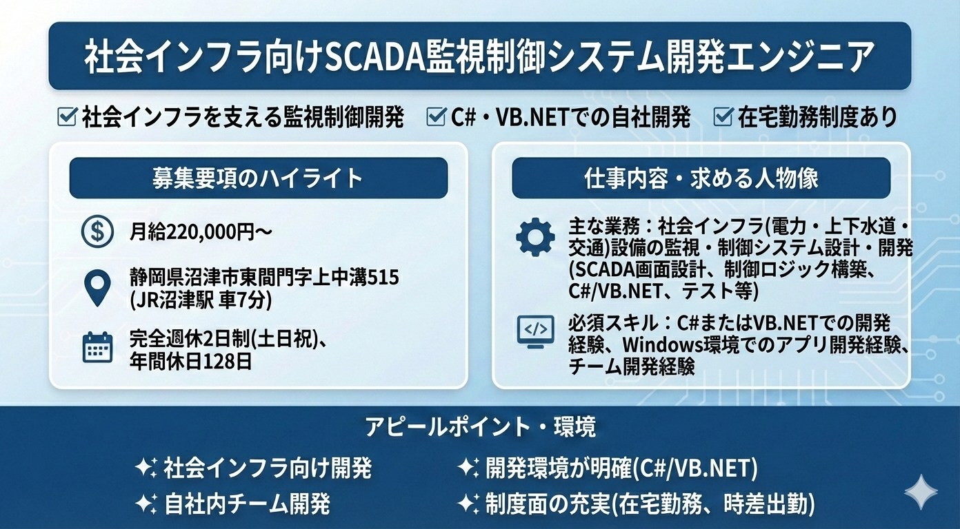 ▼社会インフラを支える監視制御開発 ▼C#・VB.NETでの自社開発 ▼在宅勤務制度あり