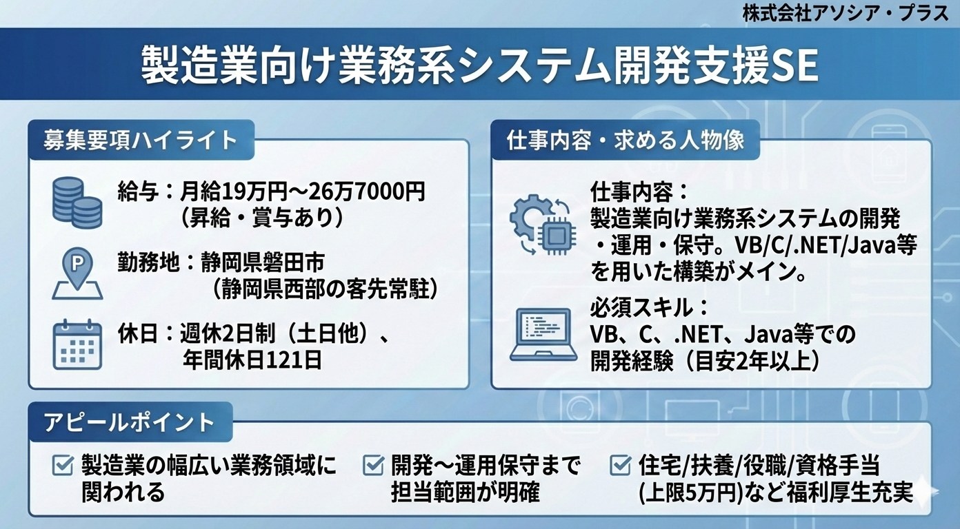静岡県西部(浜松・磐田等)のお客様先(主にヤマハ発動機やスズキ関連企業)に常駐し、製造業向けの業務系システムの開発・運用・保守を担当するエンジニア職です。主にWindows/UNIX(オープン系)環境でのシステム開発が中心で、VB・C/.NET/Java 等の言語を用いた構築がメインとなります。