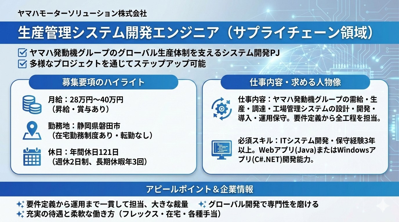 ヤマハ発動機グループにおける業務システムの設計・開発・導入を担当していただきます。