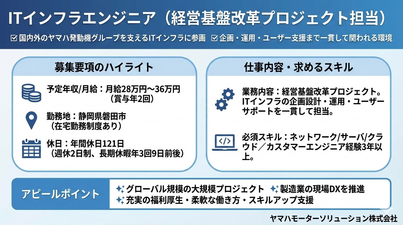 ▼国内外のヤマハ発動機グループを支えるITインフラに参画▼企画・運用・ユーザー支援まで一貫して関われる環境
