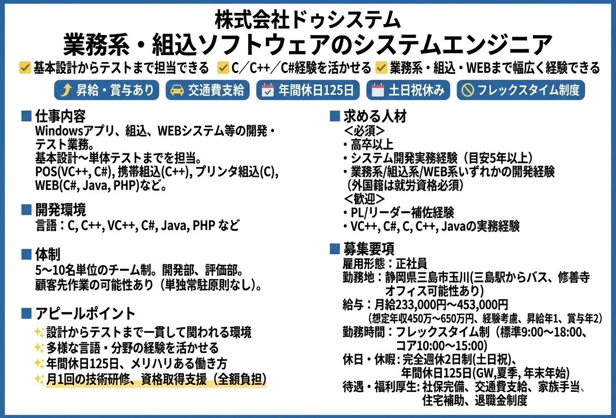 ✅基本設計からテストまで担当できる ✅C/C++/C#経験を活かせる ✅業務系・組込・WEBまで幅広く経験できる