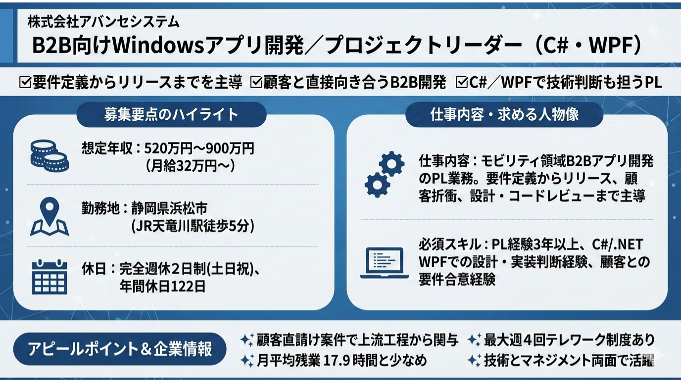 | 仕事内容 | ■業務概要: ・モビリティ領域のB2B向けWindowsアプリ開発のPL業務 ■対象: ・車両メンテナンス関連システム ■業務内容: ・顧客との要件調整、要件定義、仕様策定 ・プロジェクト計画作成、進捗・課題・リスク管理 ・設計レビュー、コードレビュー運用設計 ・開発標準化、ナレッジ整備による生産性改善 ■体制: ・約5名規模のエンジニアチーム |