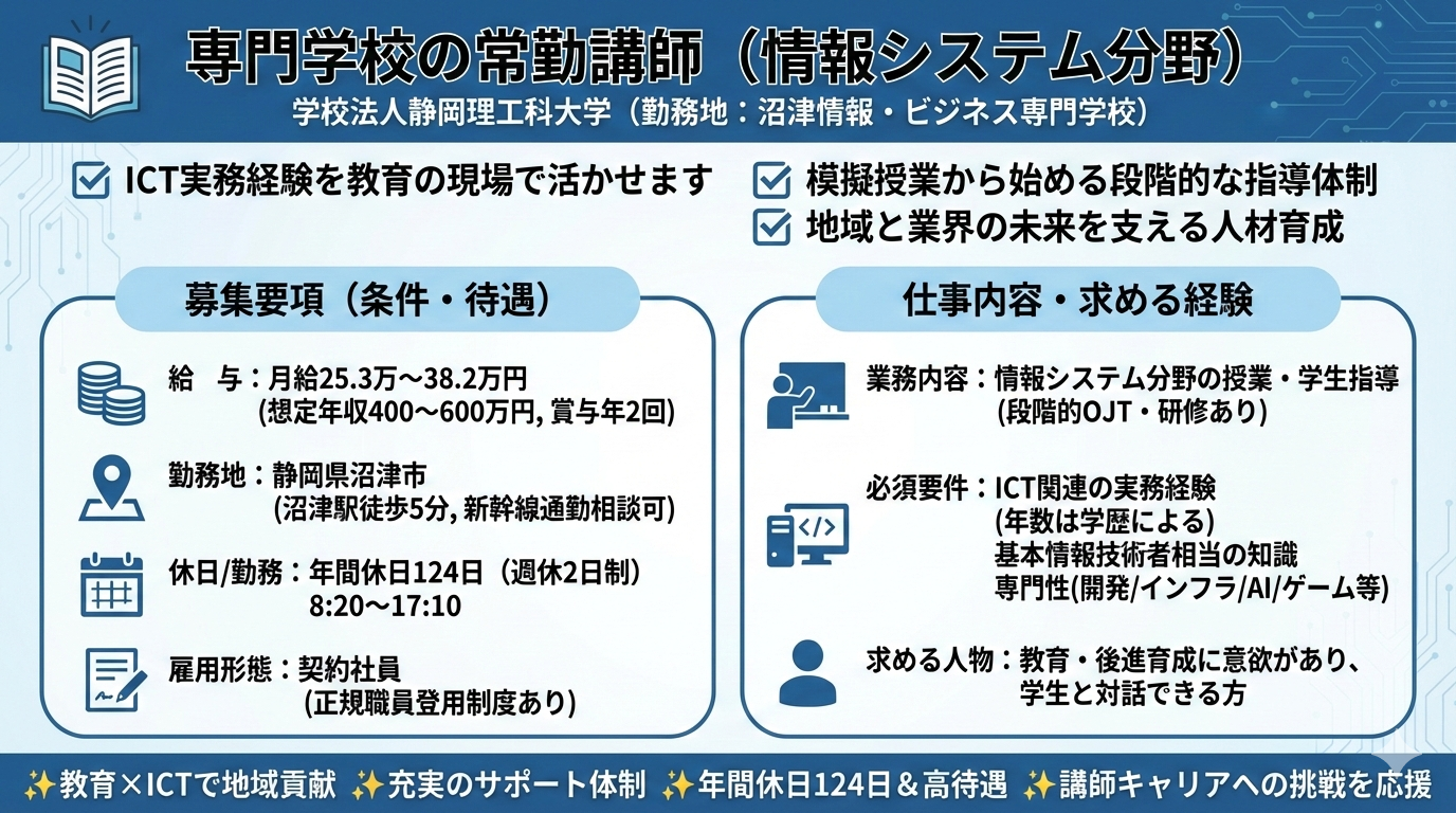 | 求める人材 | <必須スキル・経験・資格> ・ICTに関連する職務の経験がある方: サービス事業・開発系企業(SIer)企業内のシステム部門、ICTインフラ・設備系企業などのいずれかまたは複数の、最終学歴に基づく経験年数がある ・専門学校卒の場合:職務経験4年以上(2年制学科卒の場合)※3年制学科卒は3年、4年制学科卒は2年となります ・4年制大学卒の場合:職務経験2年以上 ・大学院卒の場合:経験年数不問ですが、研究分野の説明必須 ・基本情報技術者試験又は同等以上のIT基礎知識 ・ICTに関する専門性(以下の一つ以上。例示でありすべてではない) ・業務系又は制御系システム開発の実務経験、又は準ずる知識 ・プログラム開発経験、または準ずる知識(C、C++、C#、Java、Pythonなどのいずれか又は複数) ・Webのシステム開発に関すること ・ネットワーク設計・構築・運用に関すること ・データベースの設計・構築・運用に関すること ・情報セキュリティに関すること ・AI/深層学習/統計学に関すること ・Unity/UnrealEngineなどのゲーム開発に関する技術 ・サーバの構築・運用に関すること(Windows又はLinux) ※外国籍の方は就労可能な在留資格(就労ビザ等)をお持ちの方に限ります <歓迎スキル・経験・資格> ・社内外における各種プロジェクトのマネジメント経験 ・専門学校等の教育機関での教育経験のほか、企業の新人教育、社内研修、社外研修等の講師の経験 ・対人コミュニケーションを要する業務経験 ・Microsoft社、Oracle社、CiscoSystem社などのベンダ資格 ・基本情報技術者資格 <求める人物像> ・関係業界を支える後進の育成(教育)に興味・関心のある方 ・学生との対等な対話に努めることが出来る方 ・業界・仕事の魅力を学生に伝えたい思いをお持ちの方 ・業界の成長・発展に思いを持ち、新しいICT技術の習得に取り組める方 ・本校の運営方針に共感できる方「人の力とデジタルで、自然あふれる地域を未来につなぐ」 |