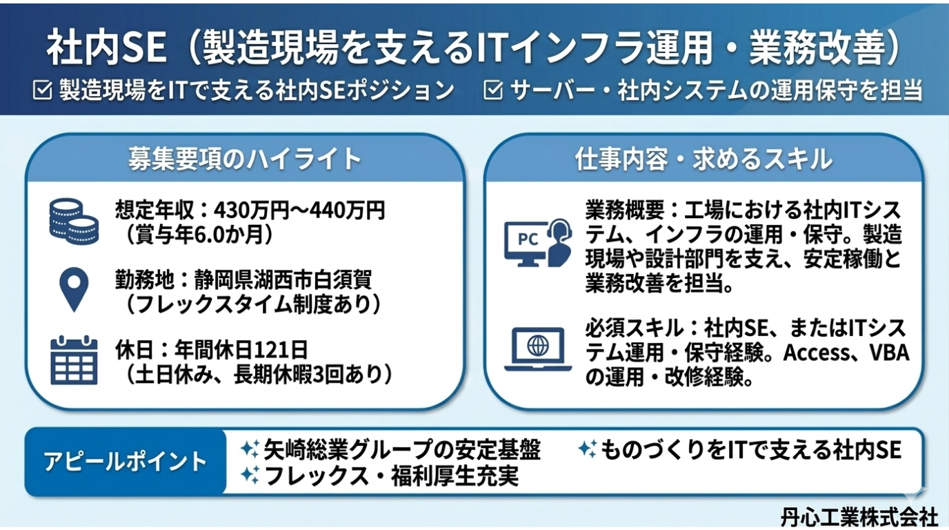 | 求める人材 | <必須スキル・経験・資格> ・社内SE、またはITシステム運用・保守の経験 ・Windowsサーバーや社内ネットワークの基礎知識 ・Access、VBAなどの業務ツールの運用・改修経験 ※外国籍の方は就労可能な在留資格(就労ビザ等)をお持ちの方に限ります <歓迎スキル・経験・資格> ・SharePointの導入または運用経験 ・製造業での社内SE経験 ・情報セキュリティ(ISMS)運用に関する知識 ・CADシステムの運用サポート経験 <求める人材像> ・社内ユーザーとコミュニケーションを取りながら課題解決できる方 ・ITの観点から業務改善に取り組める方 ・安定した環境で腰を据えて働きたい方 |