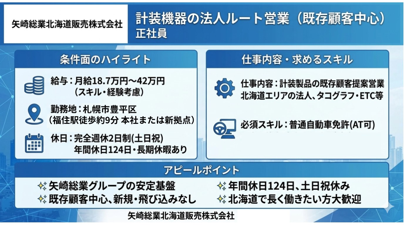 | 求める人材 | <必須スキル・経験・資格> ・営業または顧客折衝経験 ・普通自動車運転免許(AT限定可) ※<日本国籍以外の方へ> ■日本語能力試験(JLPT)N2級以上レベルの会話力・文章力を活用した業務上の専門的なコミュニケーションが必要となります。 Workplace communication requires JLPT N2-level Japanese skills or higher. ■募集職種において日本で就労可能な在留資格(ビザ)をお持ちの方 (Valid Work Visa in Japan is required) <歓迎スキル・経験・資格> ・タコグラフ、タクシーメーター、ETCなどの製品に関する知識や取扱経験がある方 ・車載機器や運行関連機器の提案・販売に関わった経験がある方 <求める人物像> ・コミュニケーション力を活かして働きたい方 ・顧客との信頼関係を大切にできる方 ・営業または接客経験を活かしたい方 ・北海道で長く働きたい方 |
