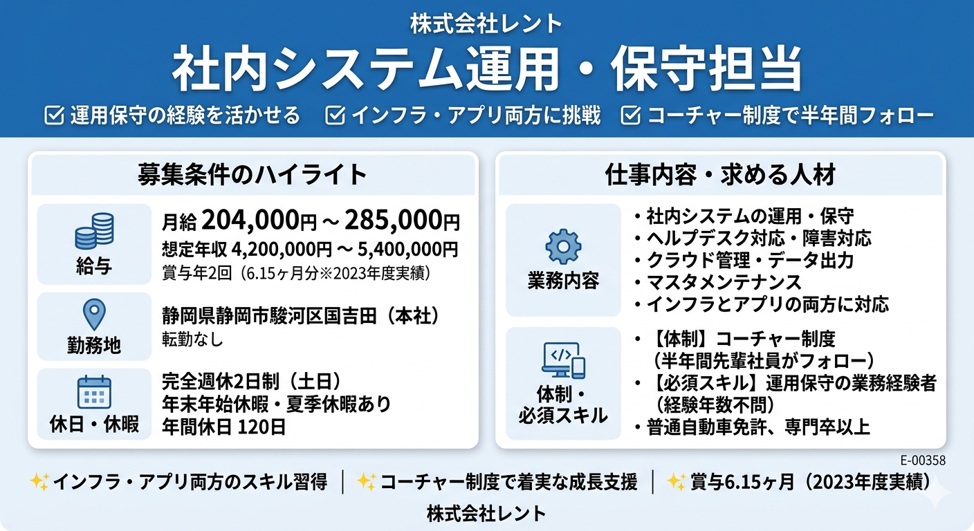 ▼社内システムの安定稼働を支える運用保守ポジション ▼インフラ・アプリ両方に携われる環境 ▼コーチャー制度で半年間のフォロー体制あり