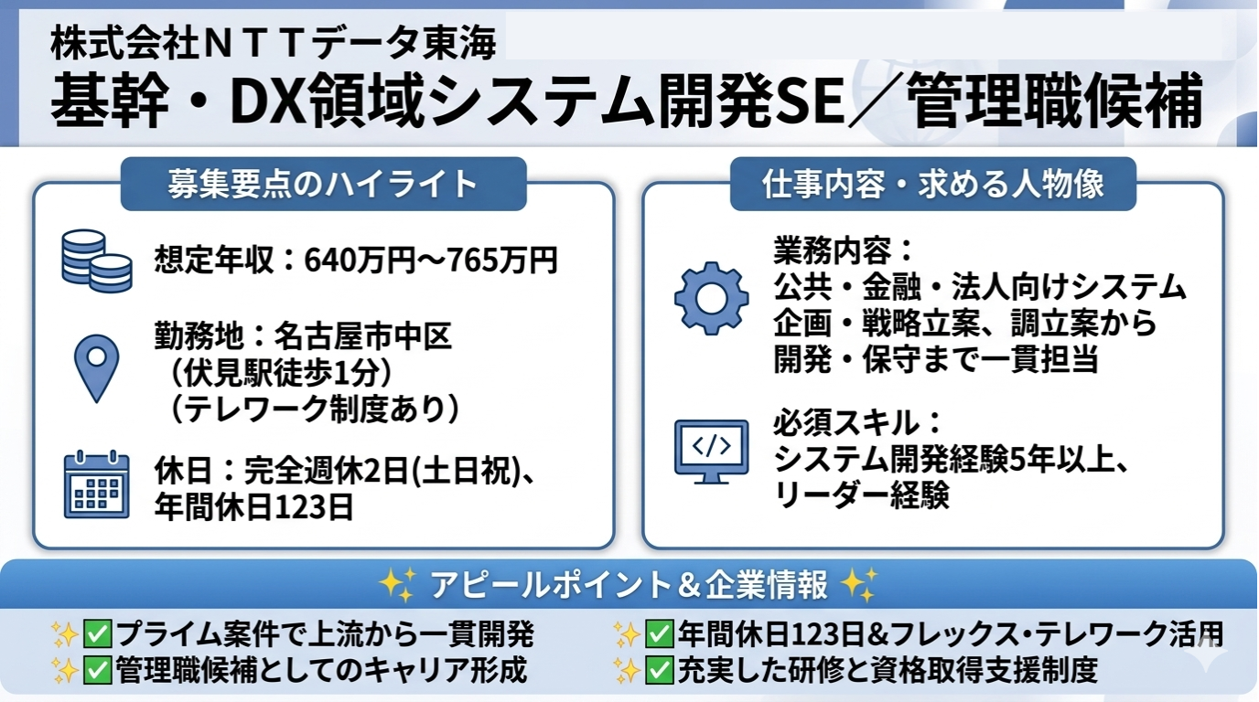 ▼上流工程から運用まで一貫して担当できます ▼管理職候補としてキャリアアップが可能です ▼東海の社会基盤を支えるITに携われます