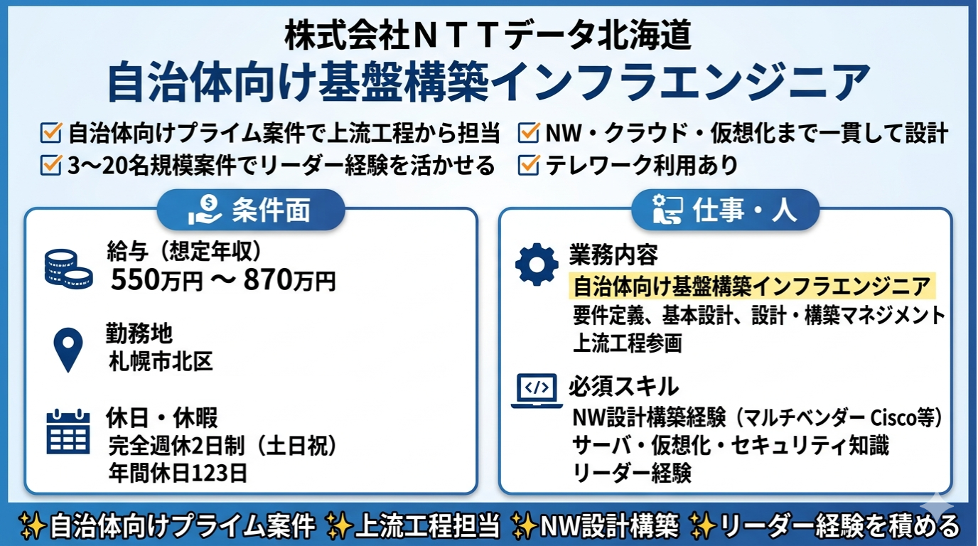 ▼自治体向けプライム案件で上流工程から担当 ▼3~20名規模の案件でリーダー経験を活かせる ▼NW・クラウド・仮想化まで一貫して設計