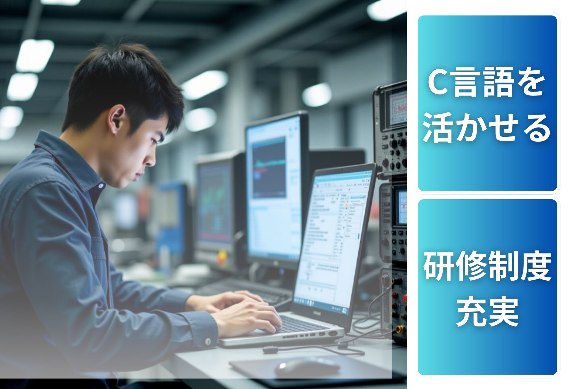 マイコン系ソフトウェア開発において、企画から開発、評価まで幅広く携わっていただきます。C言語を中心に、組込制御分野での専門性を高められる環境です。